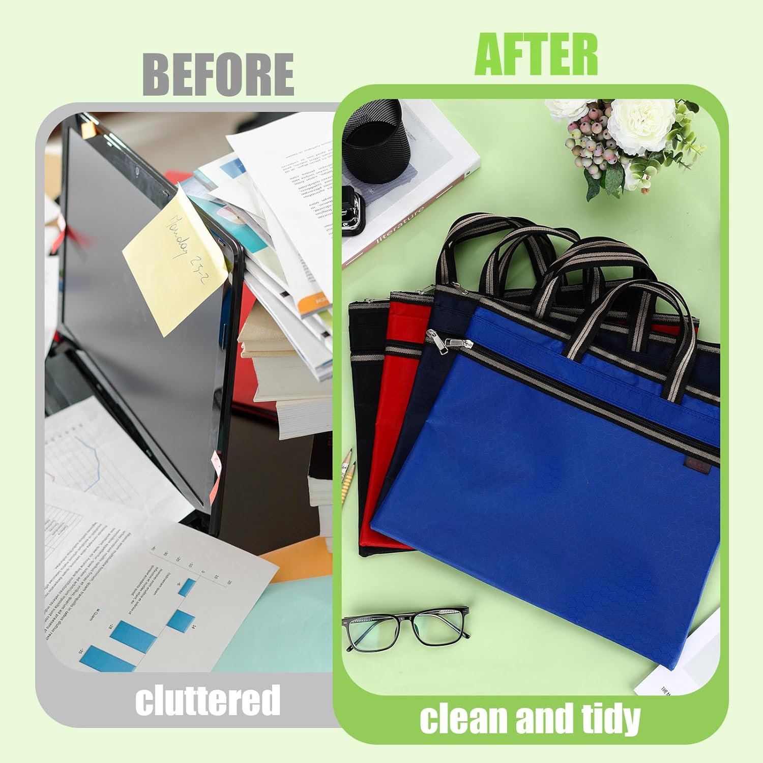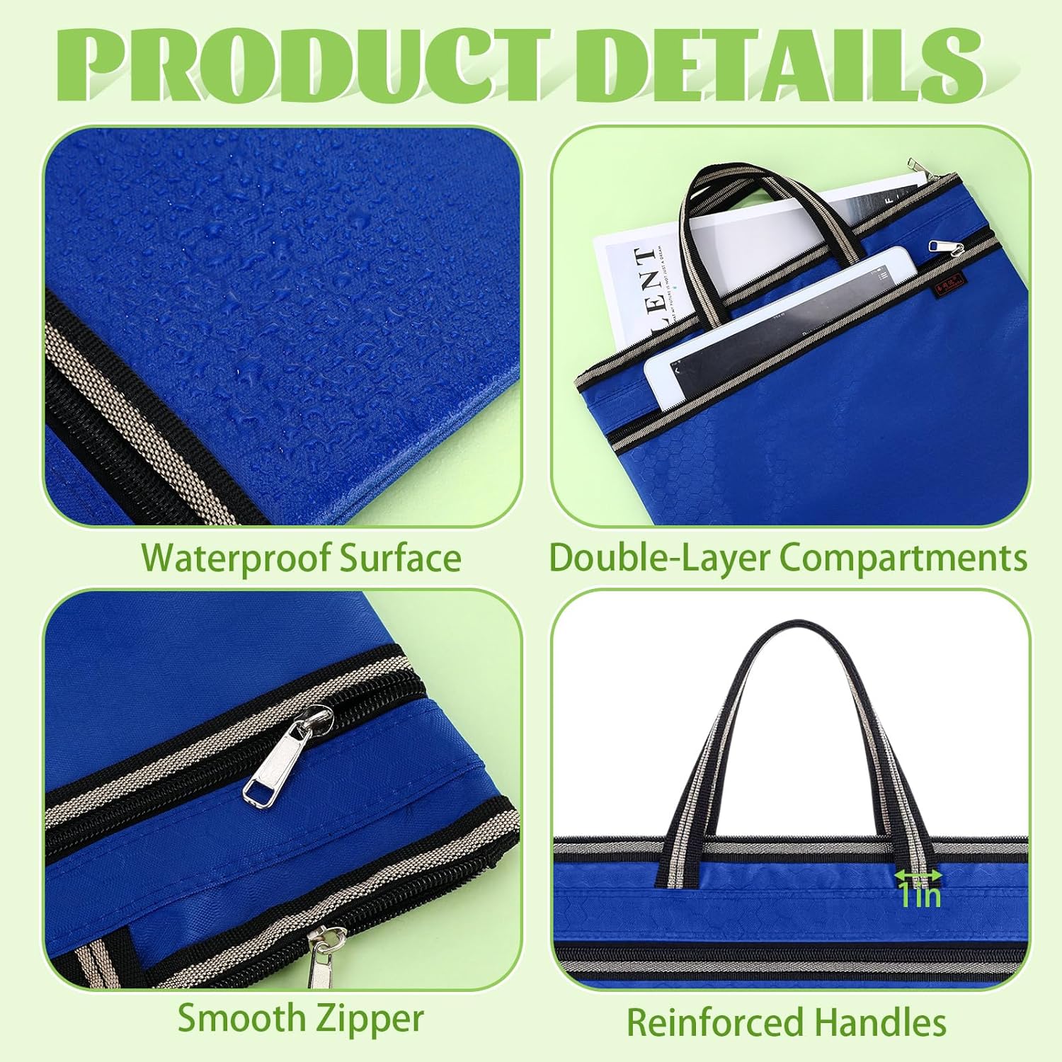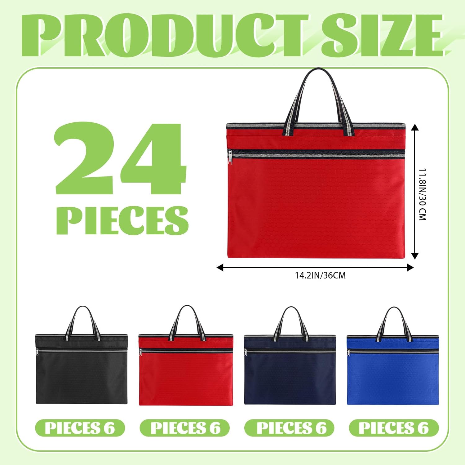 Features: Safe to Storage: This project bag features a sturdy zipper to ensure documents are securely sealed and prevent them from falling out during commutes or travel. Reinforced Handles: The widened and sturdy handle has a strong load-bearing capacity, you can carry loaded documents without straining your hand. Specifications: Material: Oxford Cloth Color: as the picture shown Size: approx. 14.2 x 11.8 inch/ 36 x 30 cm Package includes: 24 x Large Double Pocket Document Storage Bag Notes: Manual measurement, please allow slight errors on size. The color may exist a slight difference due to different screen displays