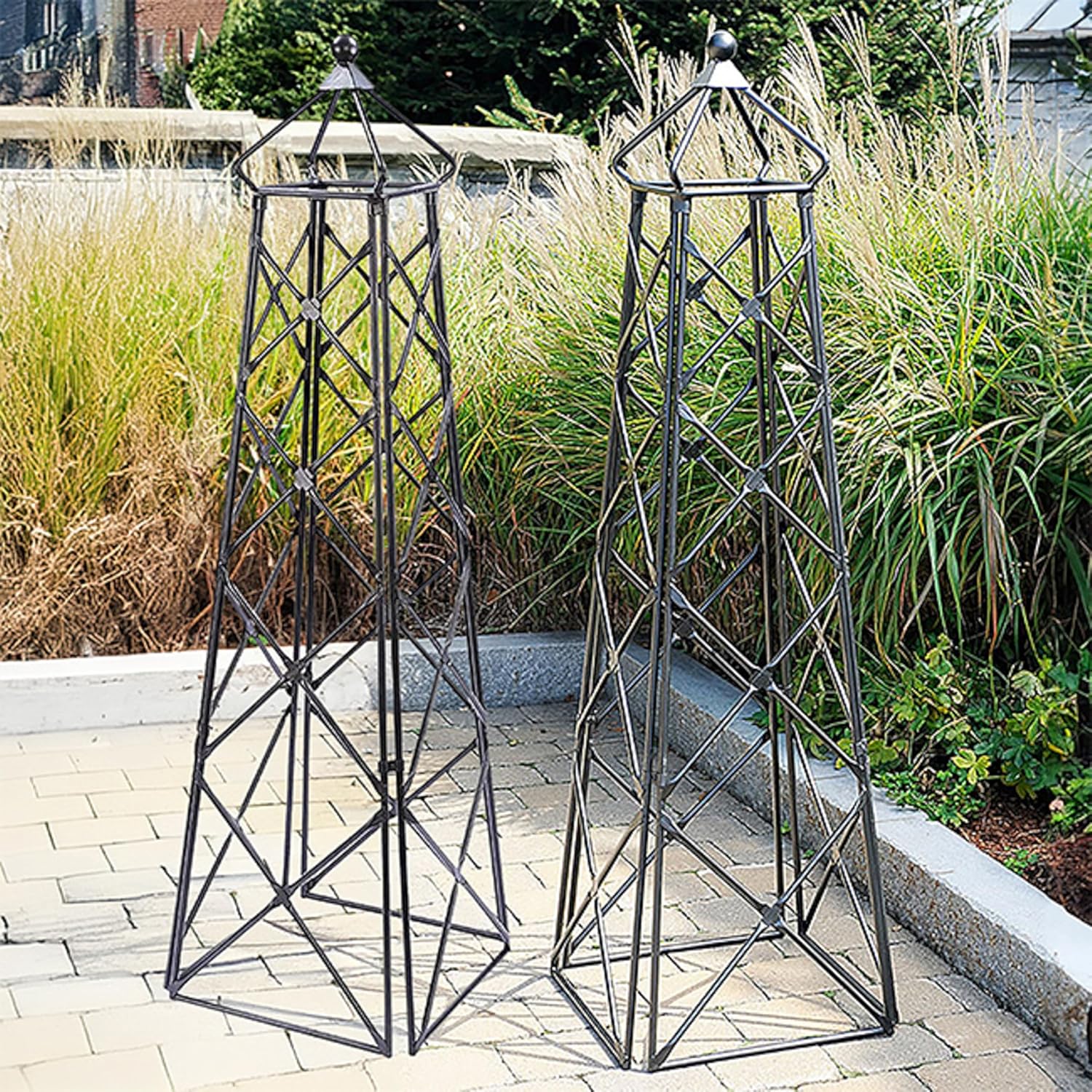 Introduce elegant height, structure, and timeless garden charm with the Achla Lattice Obelisks in Graphite, a set of two tall wrought iron plant supports designed to enhance both the beauty and health of your landscape. Standing 67 inches tall, each obelisk features diamond-shaped lattice panels that offer numerous gripping points for vines and tendrils, making them ideal for training climbing roses, clematis, cucumbers, tomatoes, and flowering vines. The lattice design helps plants grow upward with stability, improving airflow and encouraging strong growth. Completing each obelisk is a pyramidal cap and a striking orb finial, adding a decorative flourish that draws the eye upward. The graphite gray powder-coated finish blends seamlessly with garden greenery while protecting the wrought iron from rust and weather exposure. These durable structures rest easily on soil, patios, or level surfaces, and can even be placed inside large planters for an elevated effect. Perfect for flanking pathways, enhancing front and back landscaping, decorating patios, or adding vertical interest to garden beds, this matching set of two offers cohesive style and functional support. Whether you’re designing a structured vegetable garden or a flowering cottage-style display, the Achla Lattice Obelisks bring beauty, support, and long-lasting quality to any outdoor space.