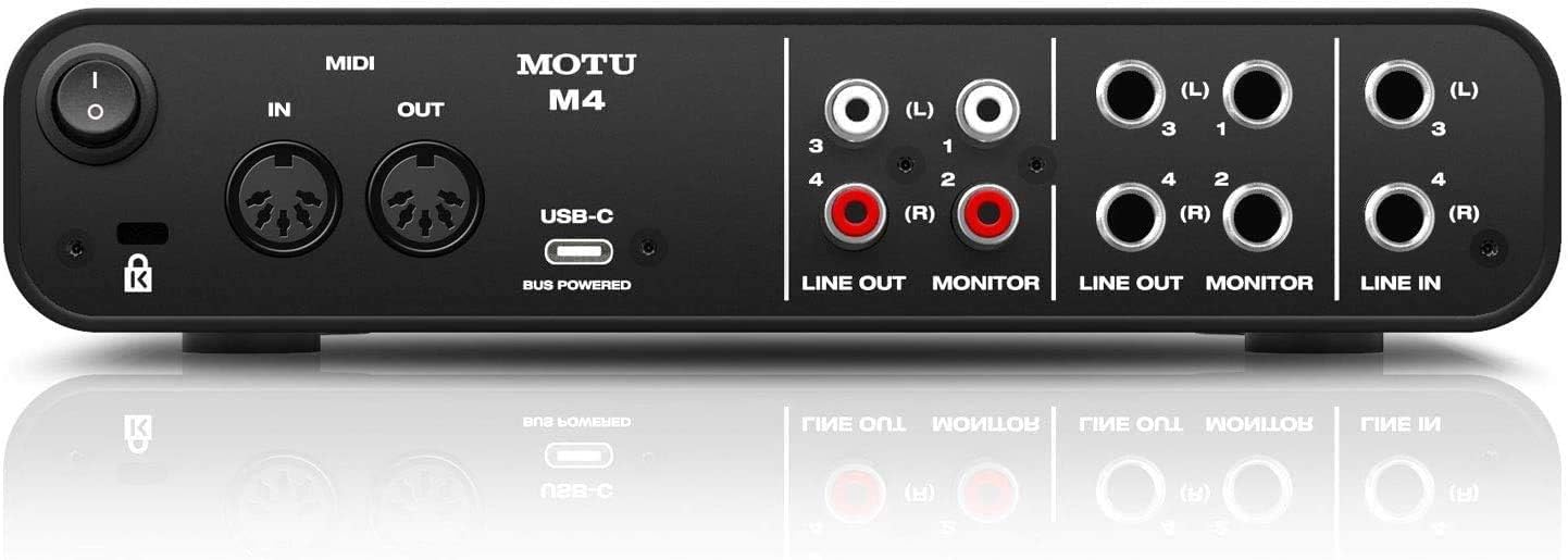 The M4 is a 4-in 4-out USB-C audio interface for Mac, Windows and iOS that offers best-in-class audio quality, best-in-class speed (ultra-low latency), and best-in-class metering. with a full color LCD screen. Record vocals, instruments, or other audio sources quickly and easily. The M4 includes MOTU Performer Lite and Ableton Live Lite production software, over 100 instruments, dozens of plug-ins, and over 6GB of loops and samples to start making music right away. Additional features include two XLR combo inputs for mic line hi-Z instruments, individual preamp gain and 48V phantom power, two balanced 14-inch line inputs, one-touch hardware monitoring for all inputs, stereo monitoring support, four balanced 14 inch DC coupled outputs, four unbalanced (mirrored) RCA outputs, mix knob to balance live input with computer playback volume control, MIDI in , channels loopback driver for live streaming and podcasting, and USB bus-powered with power switch (USB cable included) Best-in-class audio quality Equipped with the same ESS Sabre32 Ultra DAC technology found in USB interfaces. audio costing thousands, the M4 offers a staggering 120 dB dynamic range on its line outputs. ESS converters also drive the headphone output, which rivals dedicated headphone amps costing hundreds. The ultra-clean preamp circuitry produces an EIN of -129 dBu measured at the mic inputs. Capture and monitor your audio with pristine clarity Best-in-class speed The M4 provides best-in-class speed for monitoring live inputs (microphone, guitar, or keyboard) through your computer, thanks to expertly designed USB drivers. from MOTU, offering 2.5 ms round-trip latency (32 sample buffers at 96 kHz). When recording and mixing, nothing is more critical than achieving optimal levels. The M4 is the only audio interface in its class with a 160x120 pixel full color LCD display with clear and detailed level meters for all PU inputs and outputs.