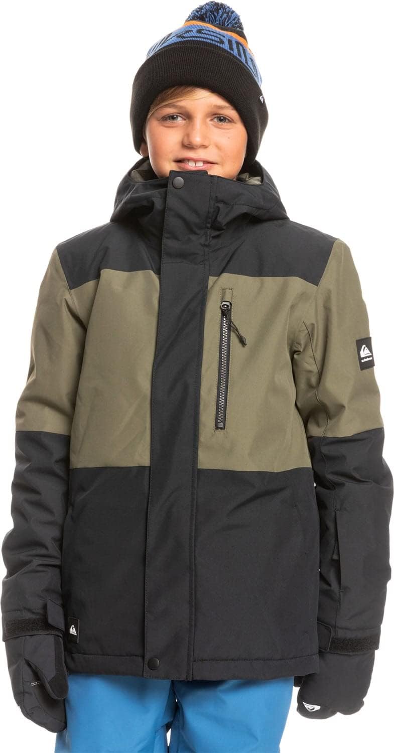 Boys' snow jacket crafted with 10k Quiksilver dry flight waterproofing technology, cut with a regular fit, and finished with warm flight insulation [fill weight of 200 gram body, 120 gram sleeves, 80 gram hood].