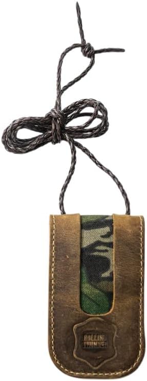 The Rolling Thunder Leather Turkey Call Wallet with camo in-lay is designed to keep diaphragm turkey calls organized, protected, and easily accessible in the field. Crafted from premium leather, this wallet combines durability with classic hunting style. A quiet magnetic closure keeps calls secure while allowing quick access, and the braided leather lanyard provides convenient hands-free carry around your neck. Built for serious turkey hunters, it offers reliable organization and protection for essential calling gear.