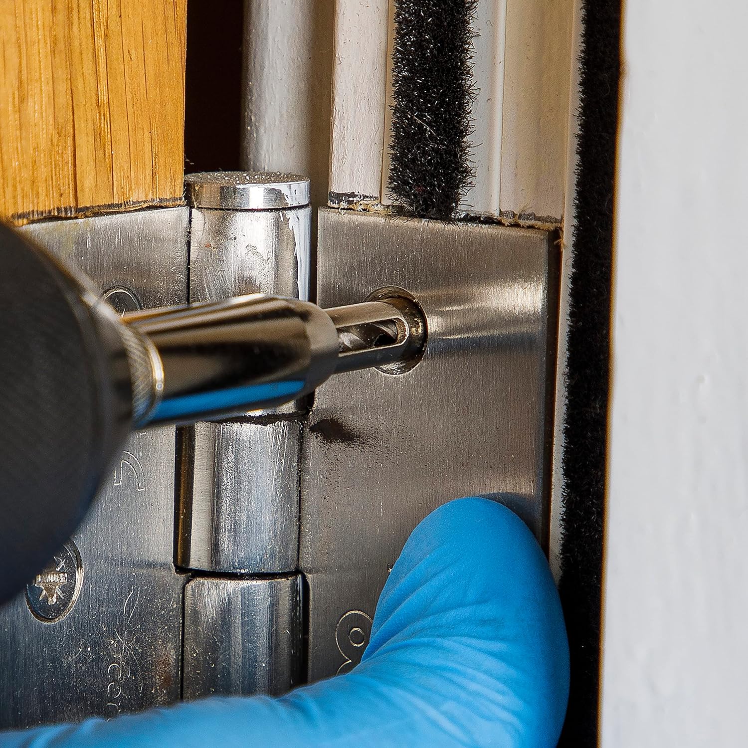 Use hinge as template by drilling directly through the holes. Spring-loaded sleeve has a chamfered tip to position centrally in hole. 1/4" Hex shank.